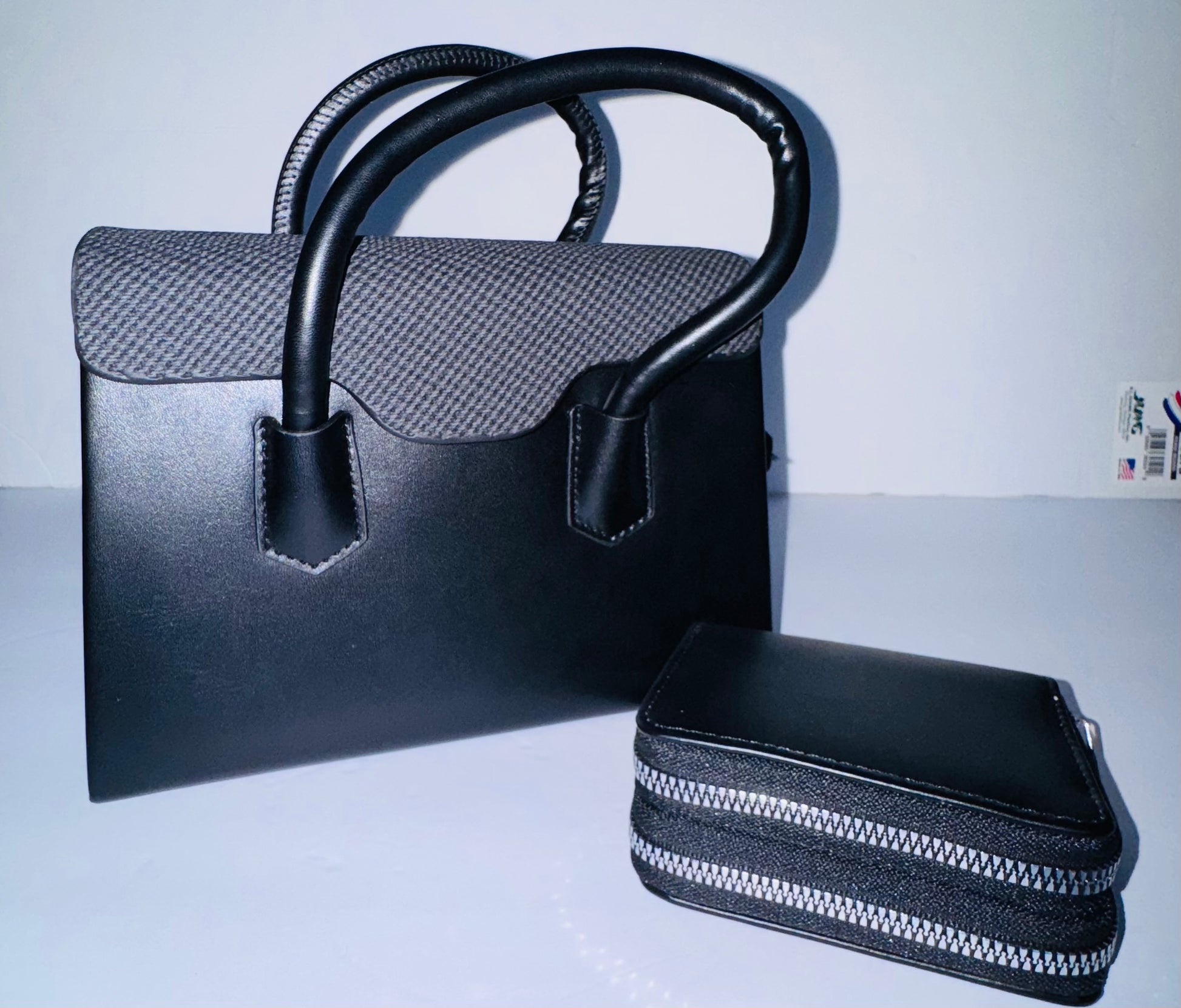 Sophisticated and timeless, this black handbag set is the definition of modern luxury. Designed with sleek textured details, silver hardware, and a chic printed scarf accent, it’s perfect for both work and special occasions. The set includes: