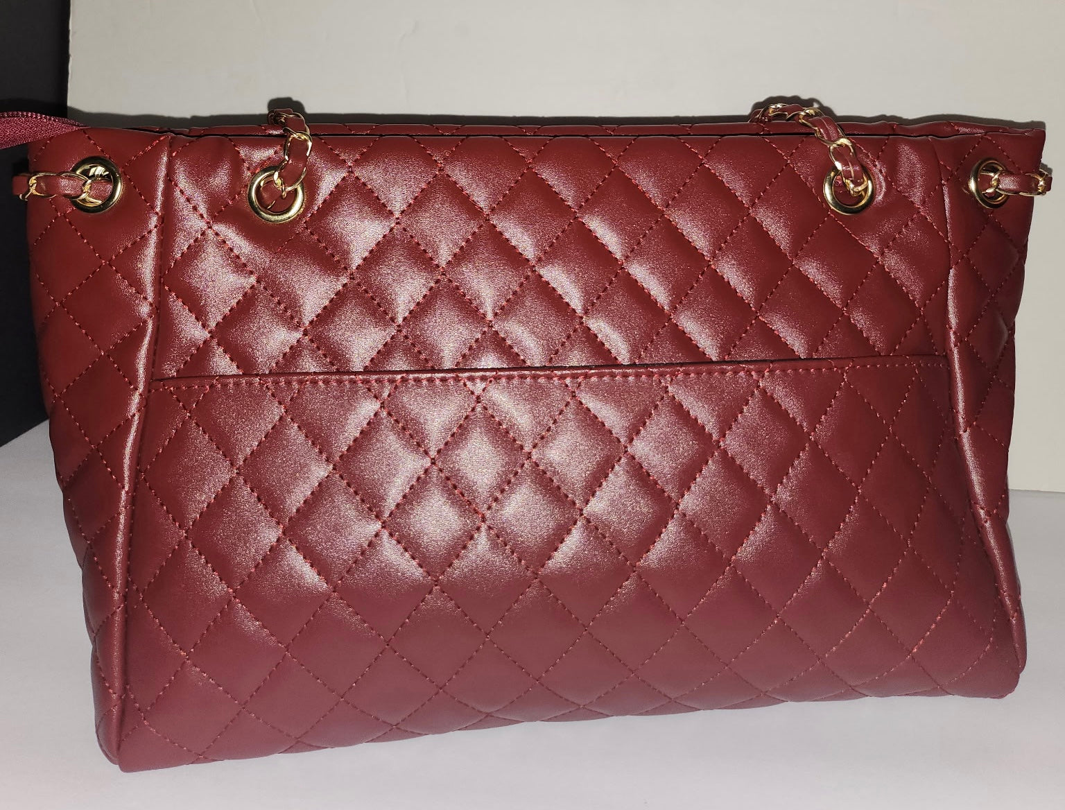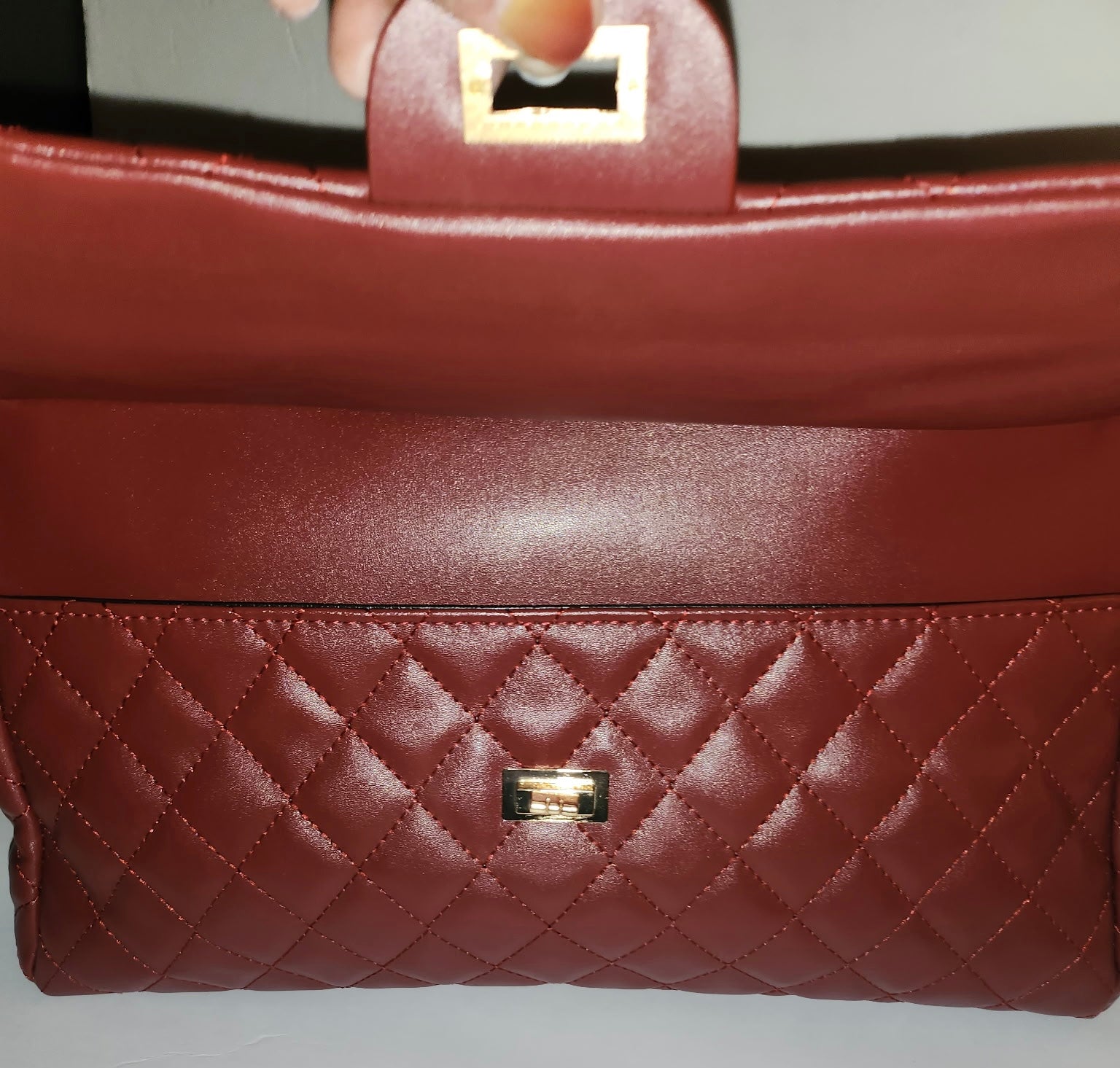 Meet Elisa! A timeless quilted handbag that blends sophistication with everyday practicality. Crafted in beautiful burgundy, it features a soft, diamond-stitched exterior, a polished twist-lock closure, and elegant silver chain-link straps interwoven with matching faux leather. Perfect for day-to-night wear, Elisa offers both style and function with a spacious interior to carry all your essentials in effortless elegance.