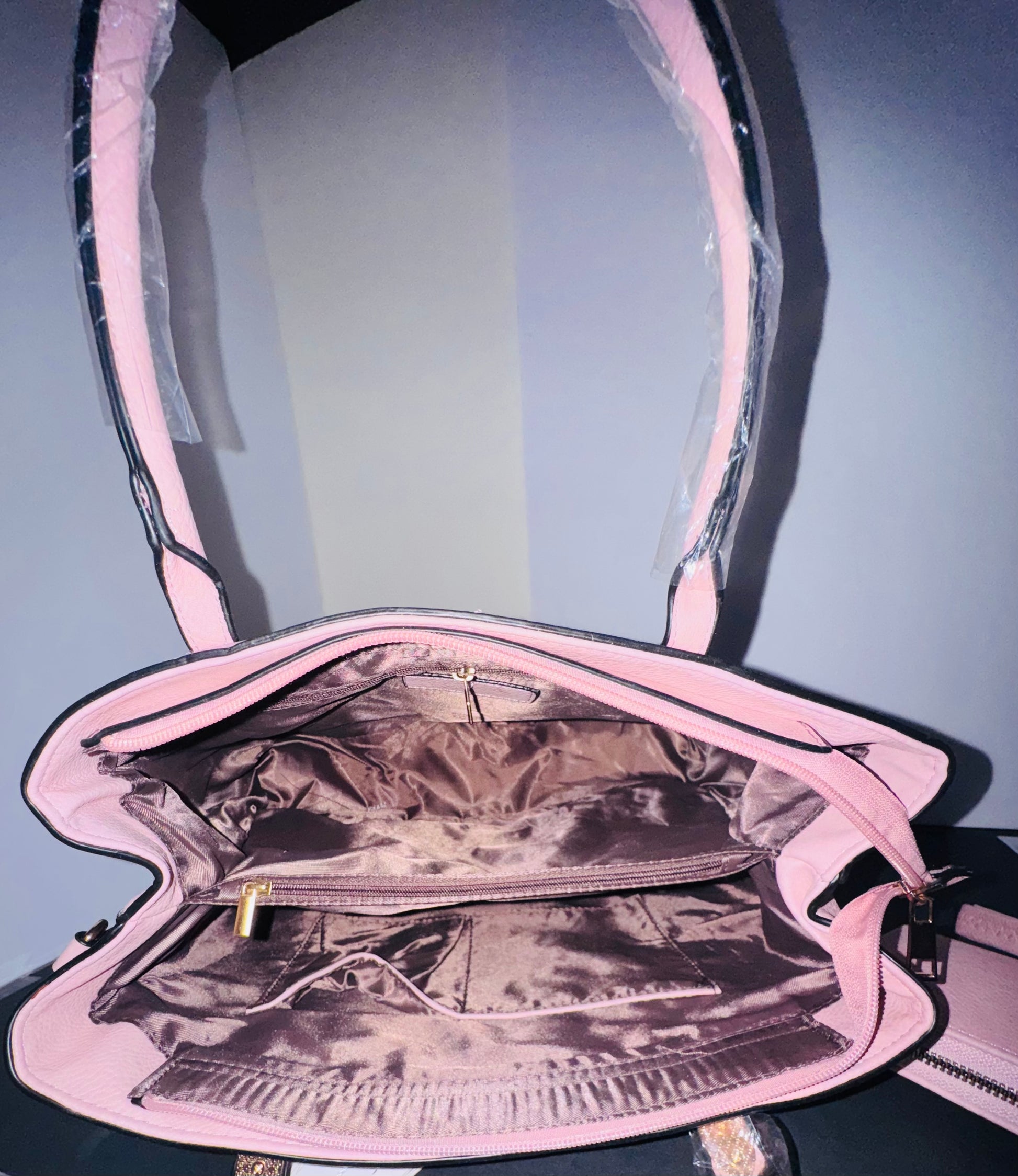 Add a touch of sweetness to your style with this Pink Teddy Bear Handbag & Wallet Set, crafted from premium vegan leather. The soft blush tones paired with metallic teddy bear accents create a look that’s both playful and polished. The structured handbag features dual handles, a detachable strap for versatile wear, and a spacious interior with multiple compartments to keep your essentials organized. The matching wallet completes the set with coordinated charm and practical storage.